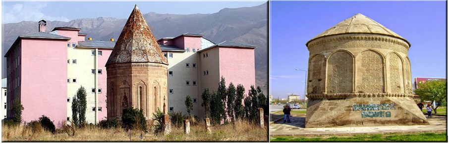 Yukarıda 1300’lü yıllarda Van’da yapılan [solda] Halime Hatun Kümbeti ve Kayseri’de 1276 yılında yapılan [sağda]Şah Cihan Hatun Kümbeti (Döner Kümbet)’ni görüyorsunuz.
