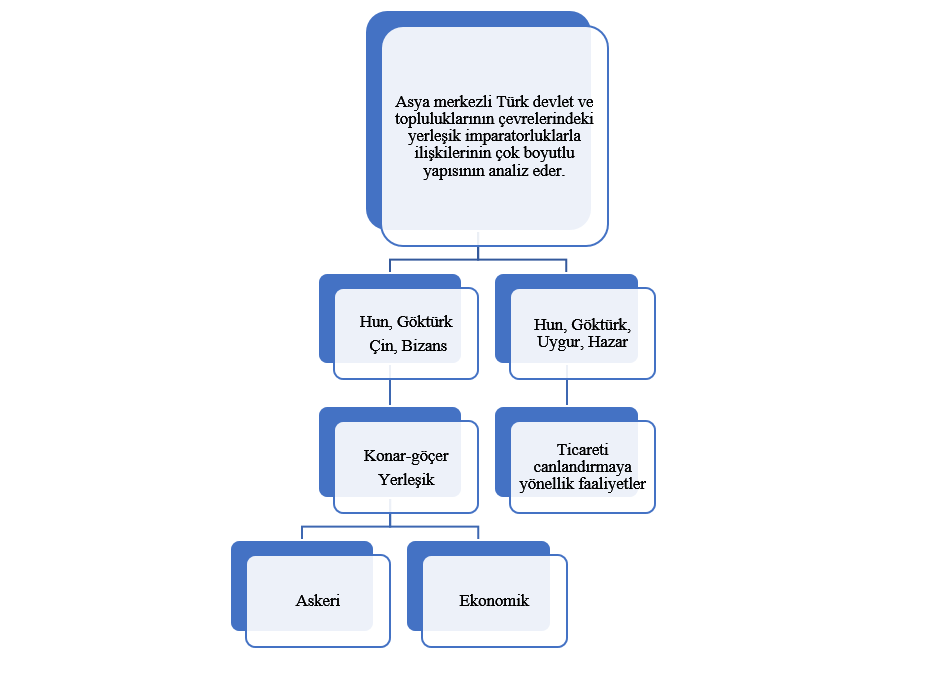 Hun, Kök Türk, Uygur ve Hazar Devletlerinin Çin, Sasani ve Bizans Devletleri ile ilişkilerinden hareketle konar-göçer ve yerleşik topluluklar arasındaki ilişkilerin çatışma ve uzlaşma eksenli olarak askerî ve ekonomik boyutlarda gerçekleştiği vurgulanır.